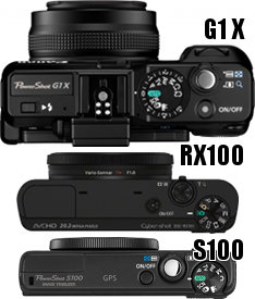 | Среди фотоаппаратов сравнительно небольшого размера отметим также Canon Poweshot G1X и Nikon Coolpix P7100. Powershot G1X имеет ещё большую матрицу - 18.7х14 мм, а также (как и Coolpix P7100) поворотный дисплей и башмак для аксессуаров, однако размеры этих фотоаппаратов гораздо габаритнее Sony RX100. |